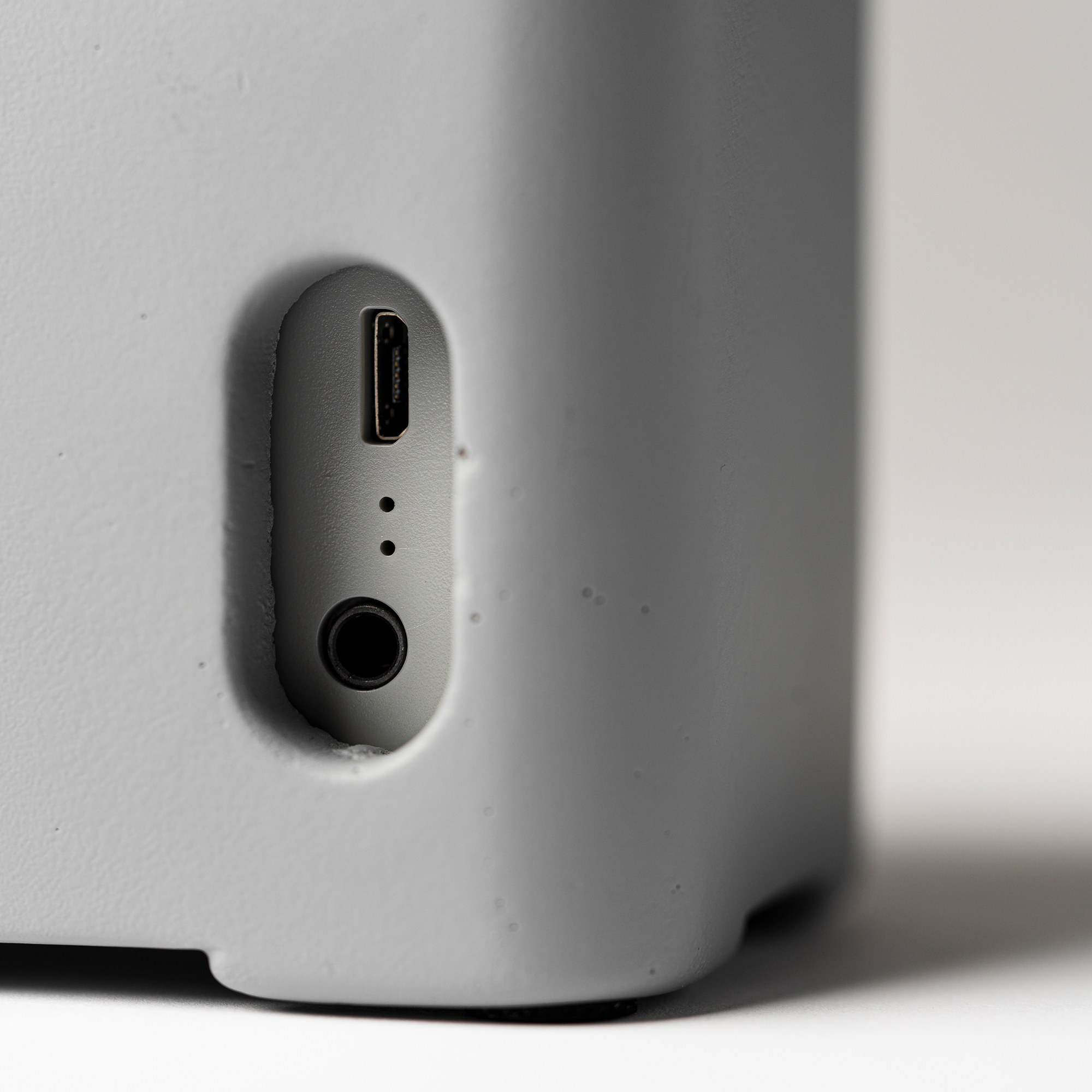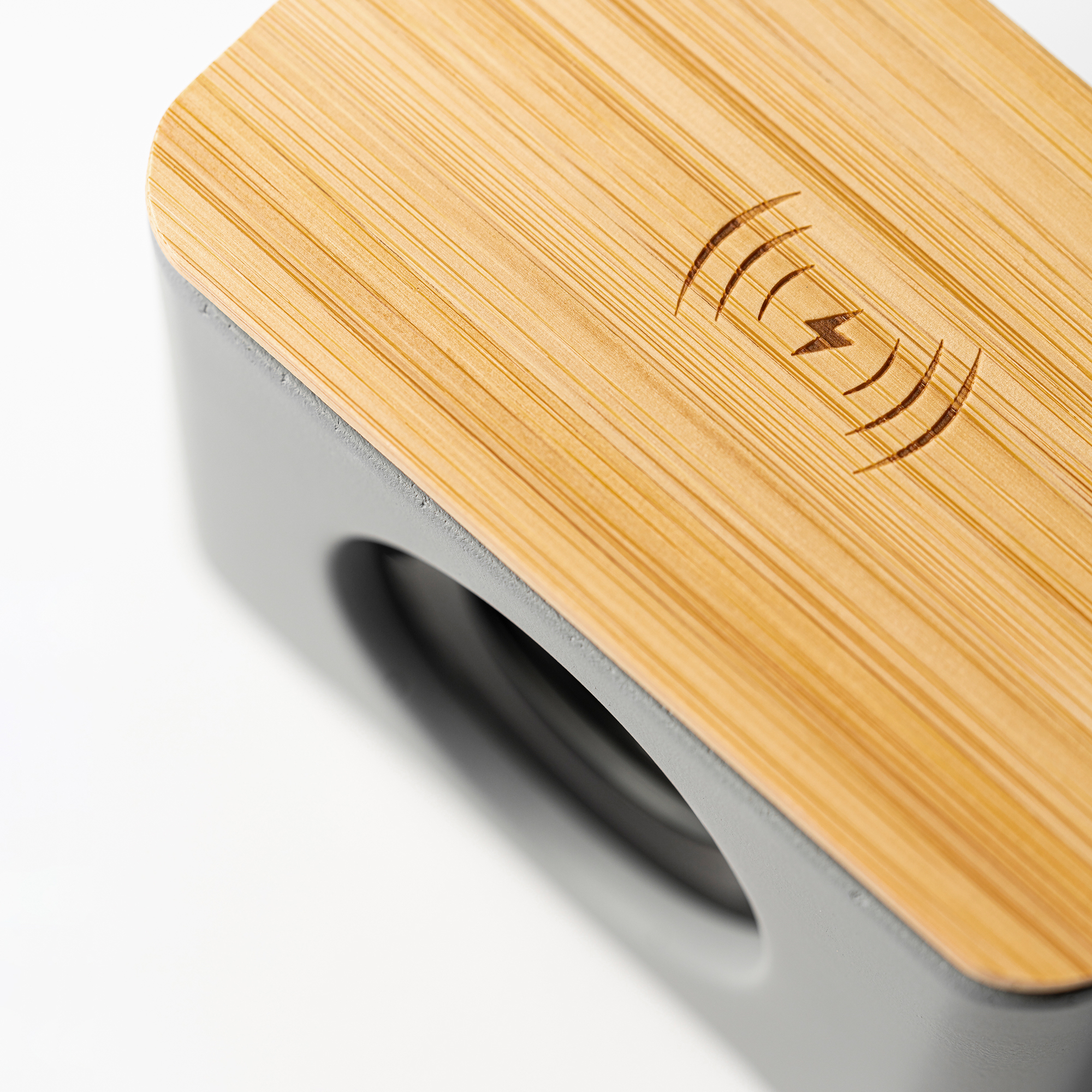 Difuzor Bluetooth cu corp dreptunghiular din material și suprafață naturală din bambus. Are o putere de 5 W, un încărcător wireless de 5 W și un acumulator Li-on reîncărcabil, cu o capacitate de 1200 mAh.