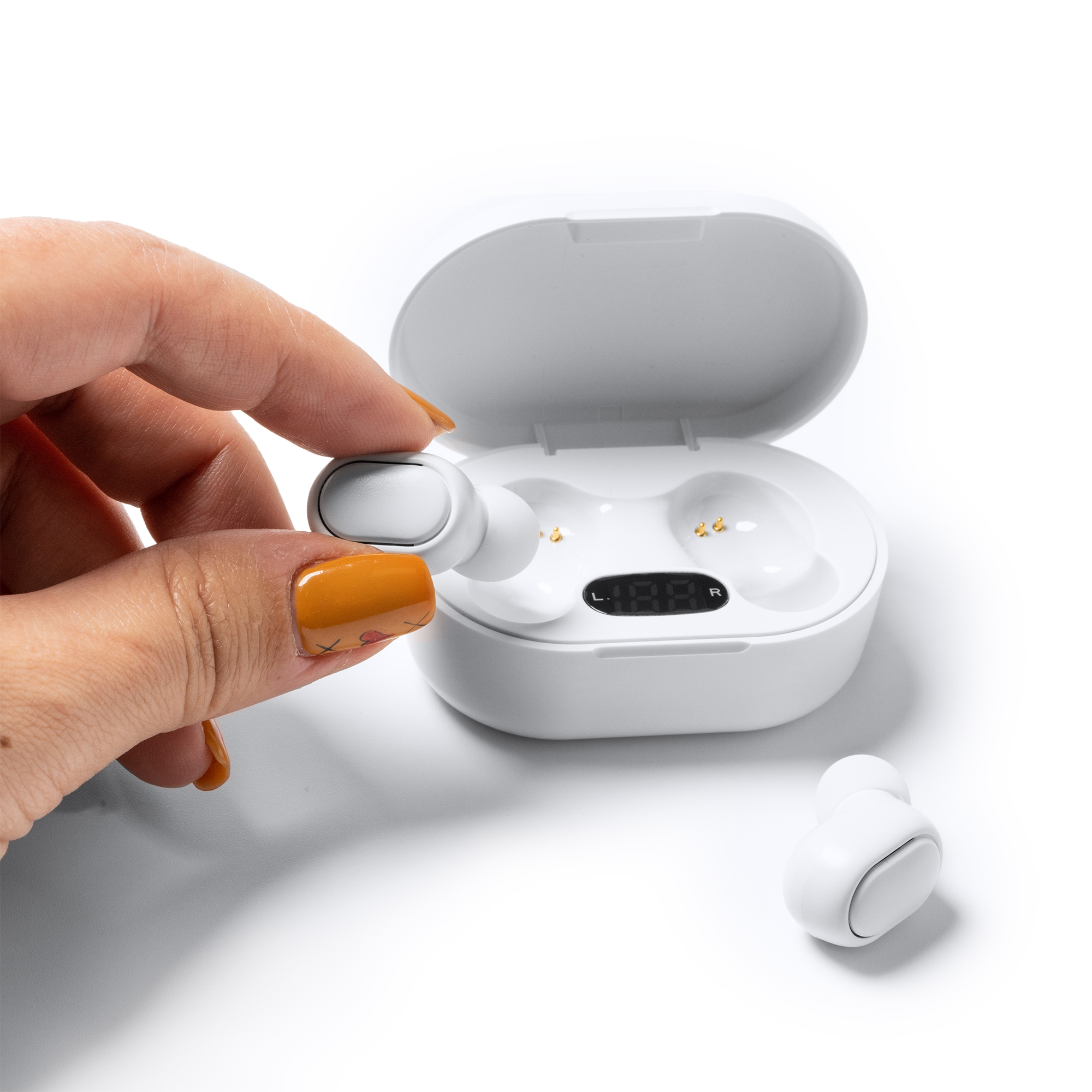 Căști wireless Bluetooth 5.0 cu carcasă de încărcare. Indicator de încărcare cu LED pe carcasă și buton multifuncțional integrat în ambele căști. Puteți asculta muzică oriunde doriți cu funcția handsfree și poate fi transportat cu ușurință în carcasa cu baterie reîncărcabilă și capac. Durată: 3-4 ore. Cablu inclus.