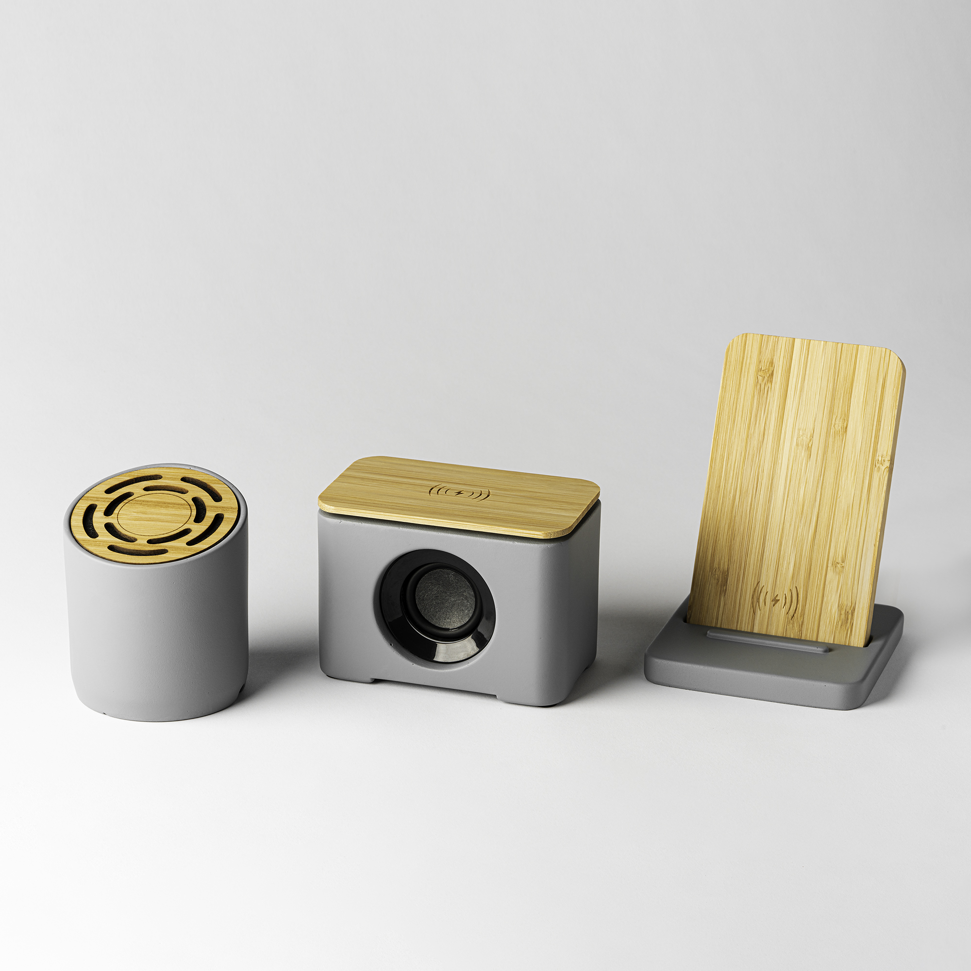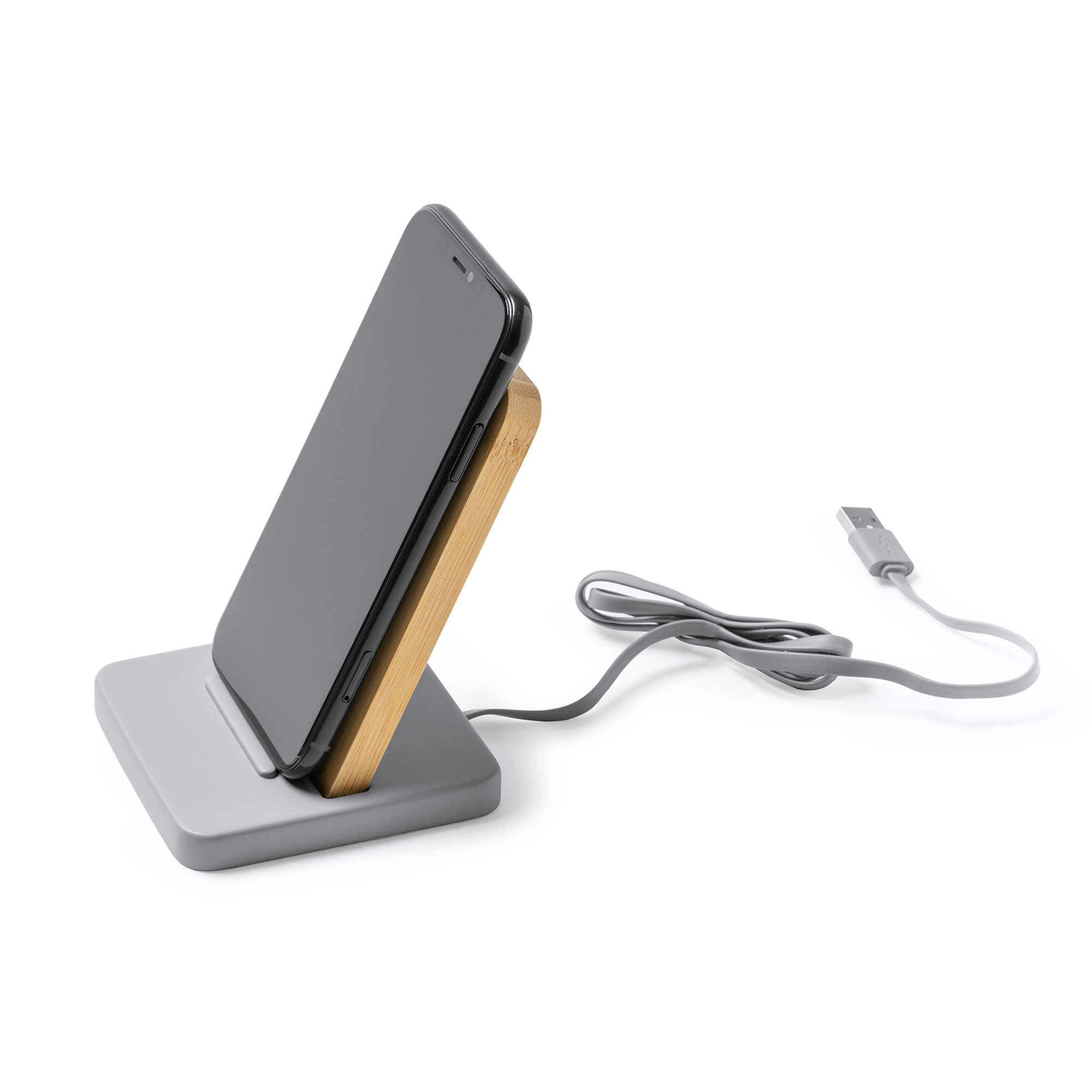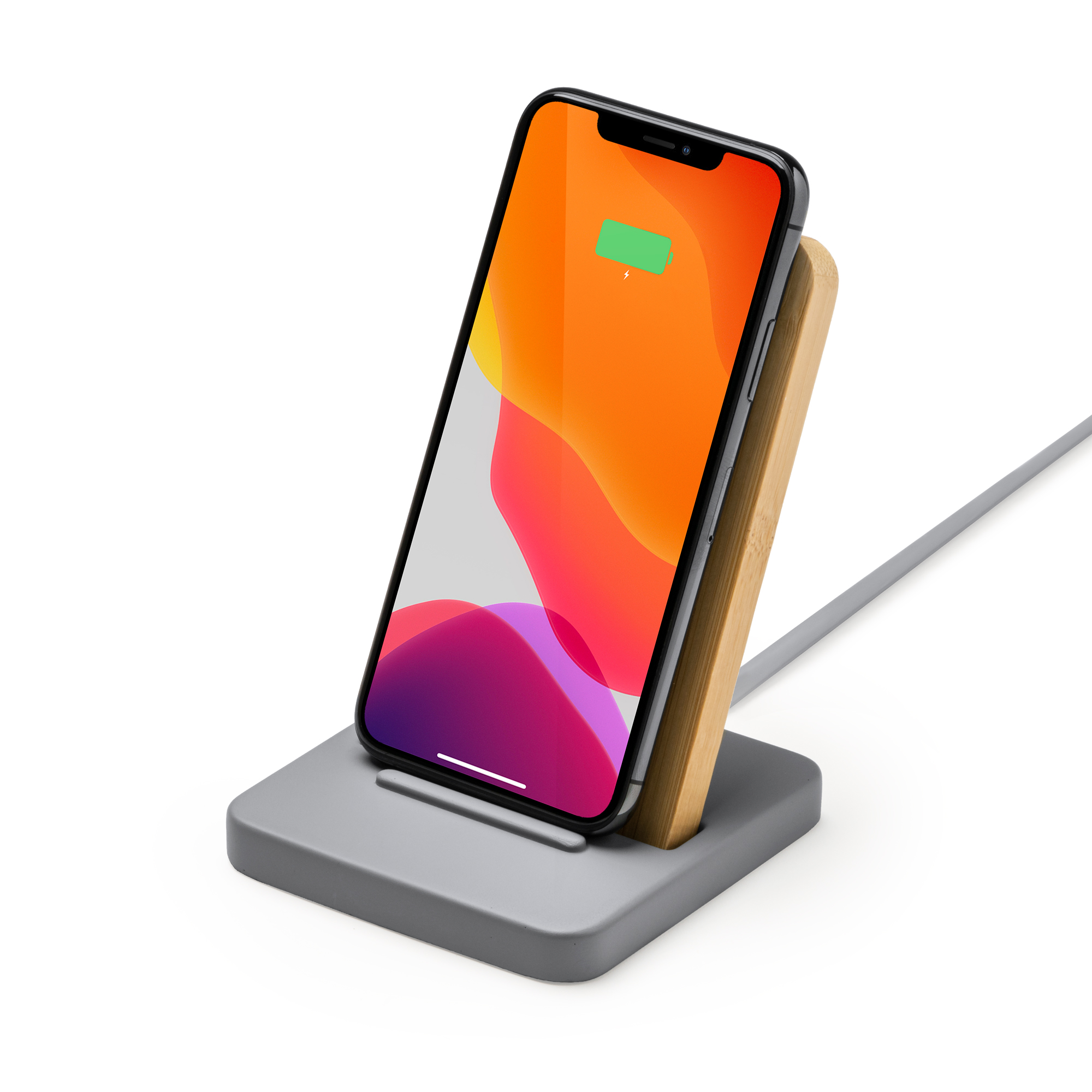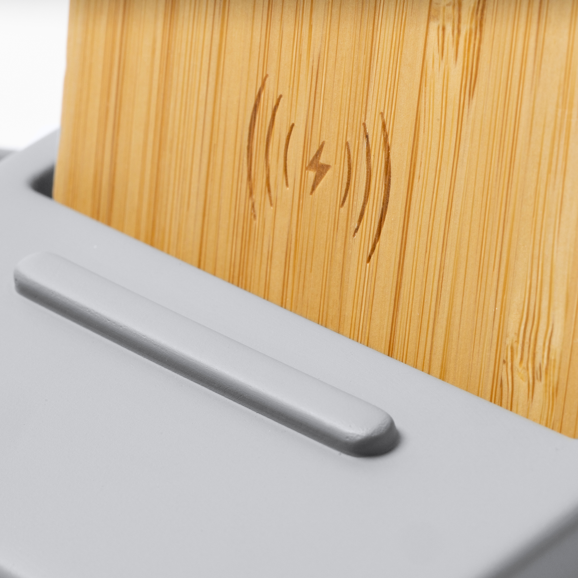 Încărcător wireless cu putere de 5W, realizat cu bază pătrată din ciment calcaros și suport rectangular din bambus natural. Așezați-vă smartphone-ul deasupra și lăsați-l să se încarce. Compatibil cu modelele cu tehnologie wireless. Cablu inclus.